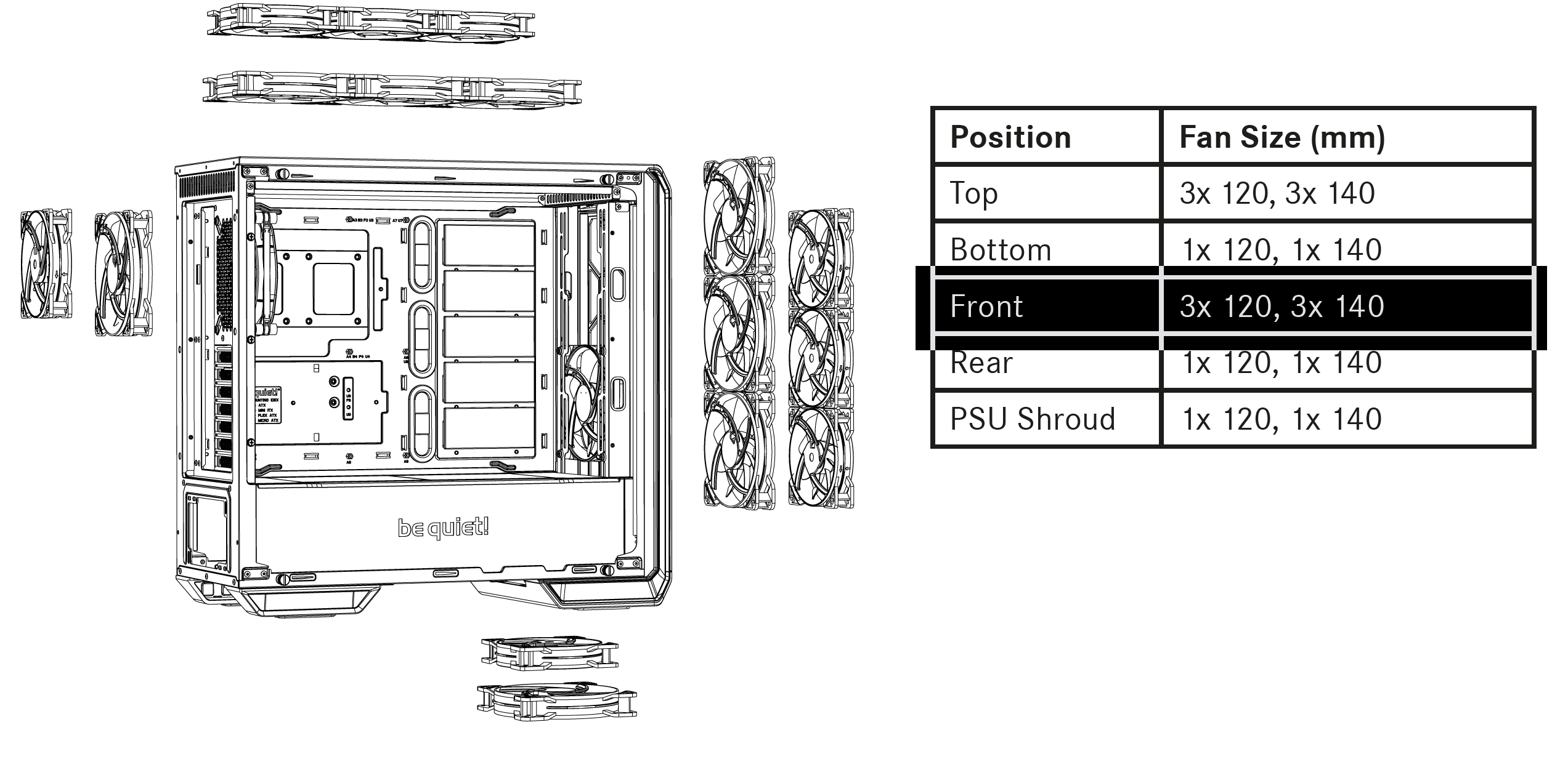 이 제품은 현재 사용중인 Be Quiet! Dark BASE 700에 번들로 장착된 팬임에도 불구하고 메뉴얼에 표기된것과는 다르게 140mm 3개 동시 장착이 안되니 구입시 유의하시길 바란다. 처음에는 배치를 잘못했나 생각했지만 장착 부위를 아무리 뜯어봐도 나사 구멍의 위치 자체가 팬 사이즈보다 작게 되어 있으니 불가능함을 알 수 있다. 덕분에 상단 배기용으로 하나 더 배치할수 있었는데 딱히 마음에 들지는 않는다. 상단 배기는 1개만 쓰면 되는데 2개를 달아봤자 배기홀이 1개분량밖에 나있지 않기 때문이다. 해당 내용은 케이스 리뷰에서 다룰려고 했으나 현재 굴러가는 꼴을 보니 본인이 이 케이스의 리뷰를 정식으로 올릴 일이 없지 싶어서 쿨러에서 간단하게 소개한것이니 양해 바란다.