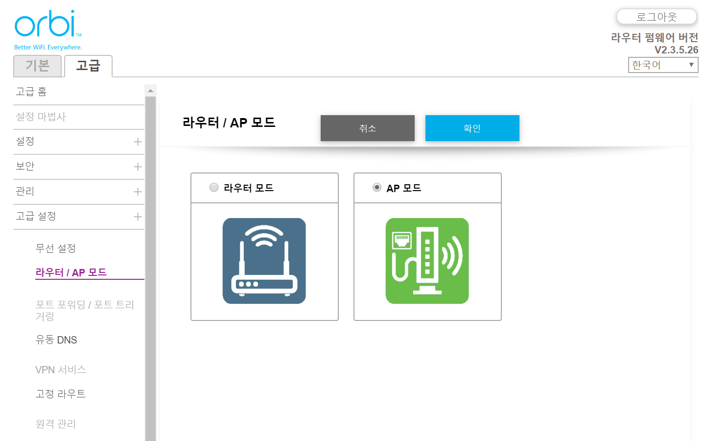4. 위 이미지를 참조해 해당 메뉴에서 '라우터 모드' 를 'AP모드' 로 변경한 후 확인 버튼을 눌러준다.