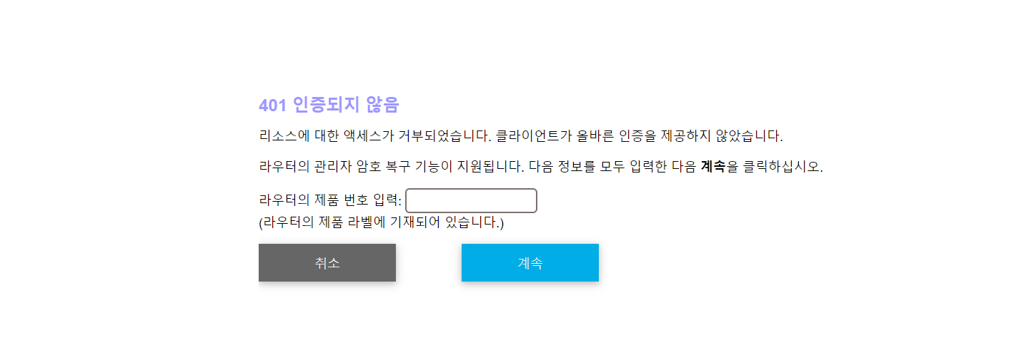 A4. 세팅 메뉴 진입시 로그인 메뉴가 뜨면 취소를 선택합니다. 아래 이미지와 같은 화면이 나타나면 기기의 시리얼 번호를 입력해줍니다. 첫 세팅때 본인 확인 질문 2가지를 입력했다면 이에 대한 답을 입력하고 새로운 비밀번호를 세팅할 수 있습니다.