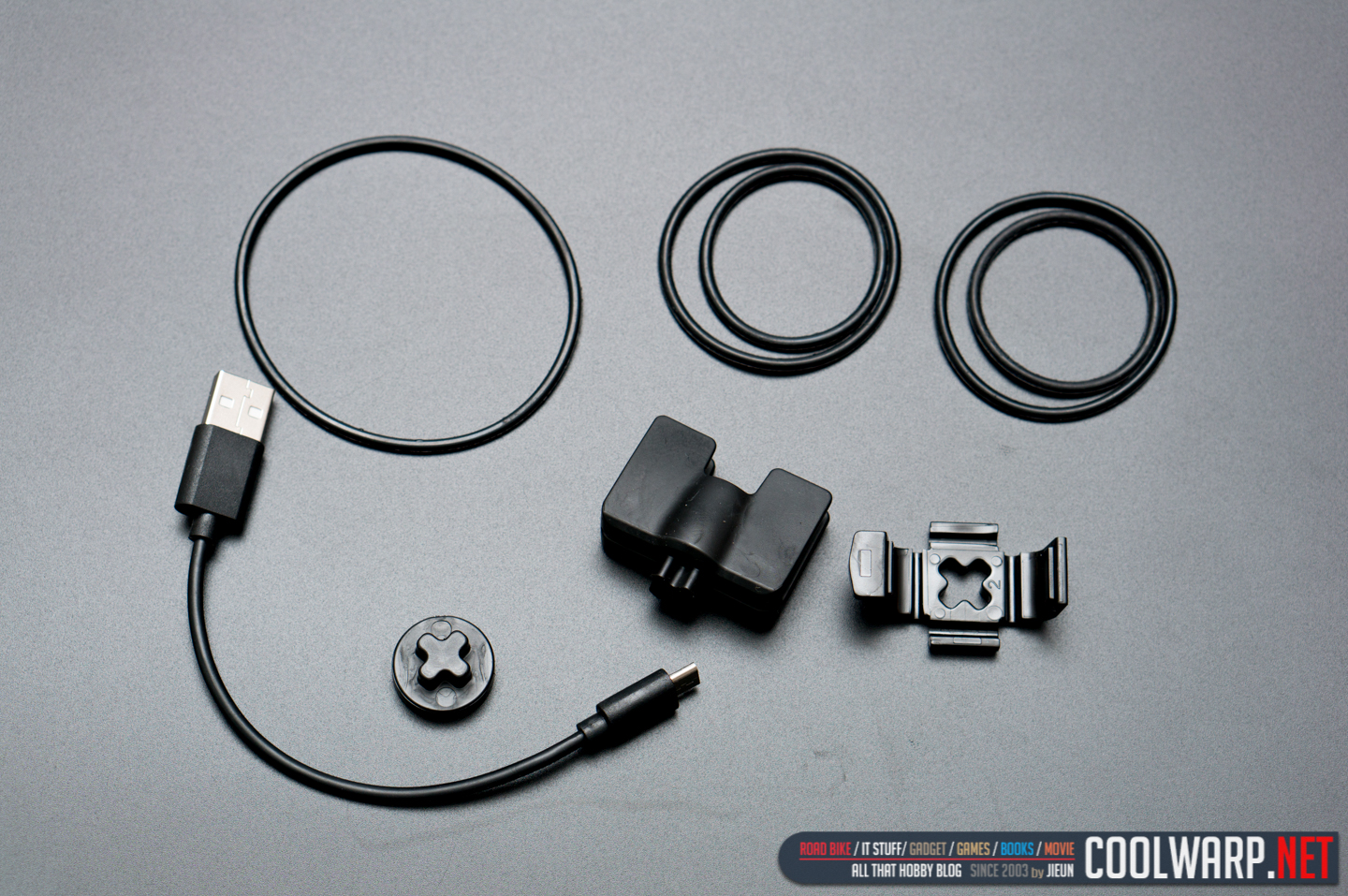 ACE와 동일한 구성품이다. 충전 케이블, 가방이나 옷에 사용되는 고정용 마운트와 고무 부품, 에어로 싯포스트와 노멀 싯포스트 모두 호환되는 마운트, 그리고 마운트를 잡아줄 사이즈 별 고무링들.