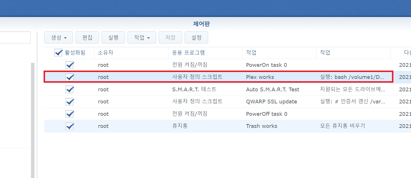 이후 DSM의 작업 스케쥴러에서 해당 스크립트를 "사용자 정의 스크립트"에 등록하면 된다. 참고로 아래와 같은 형식으로 입력하면 된다. root 설정을 해줘야 한다.