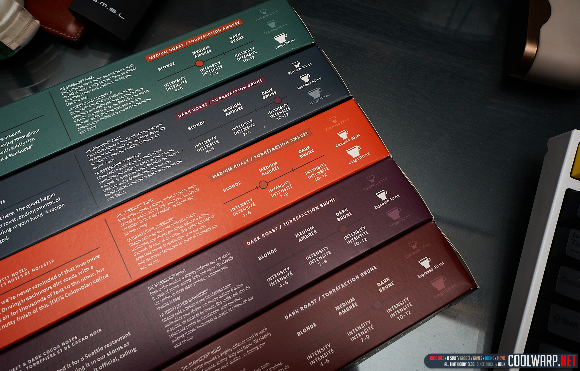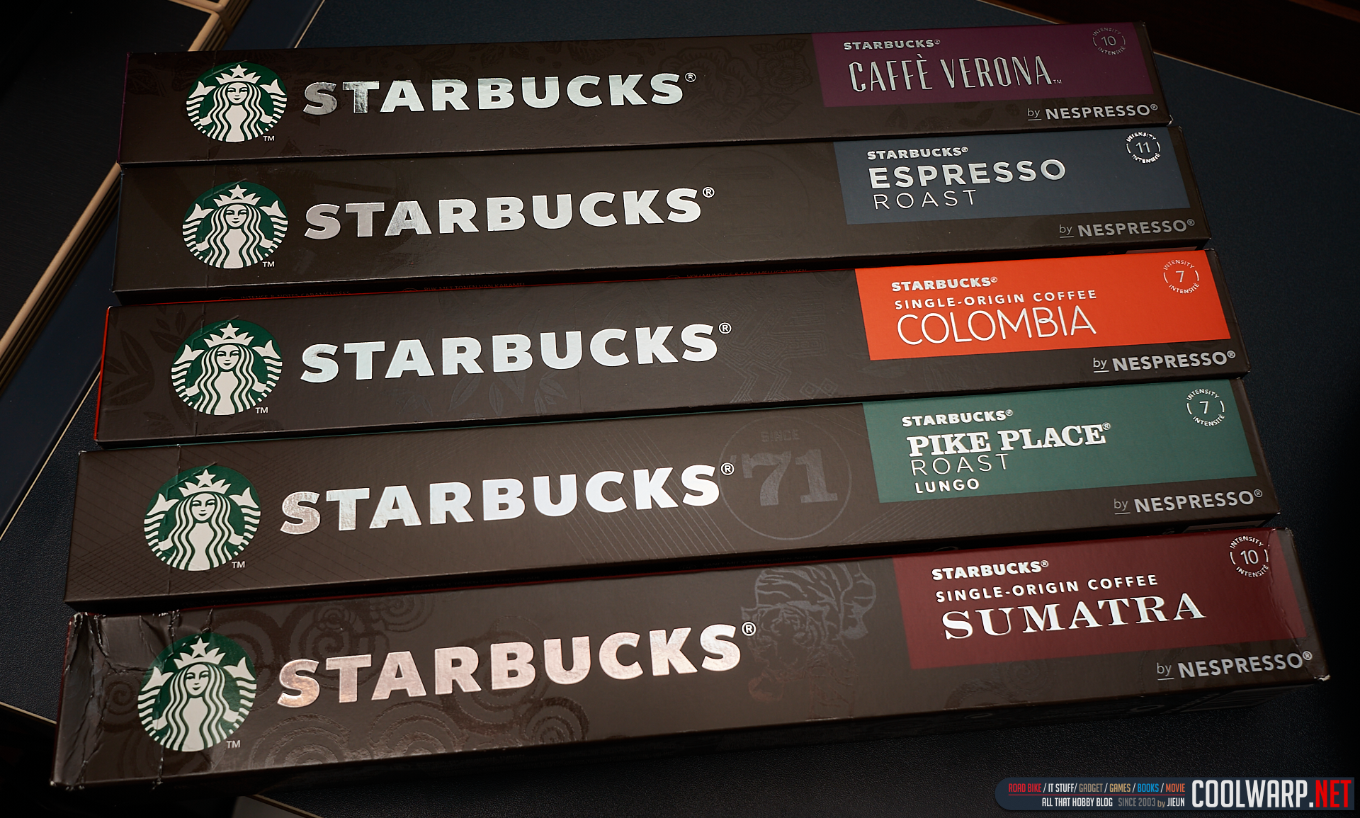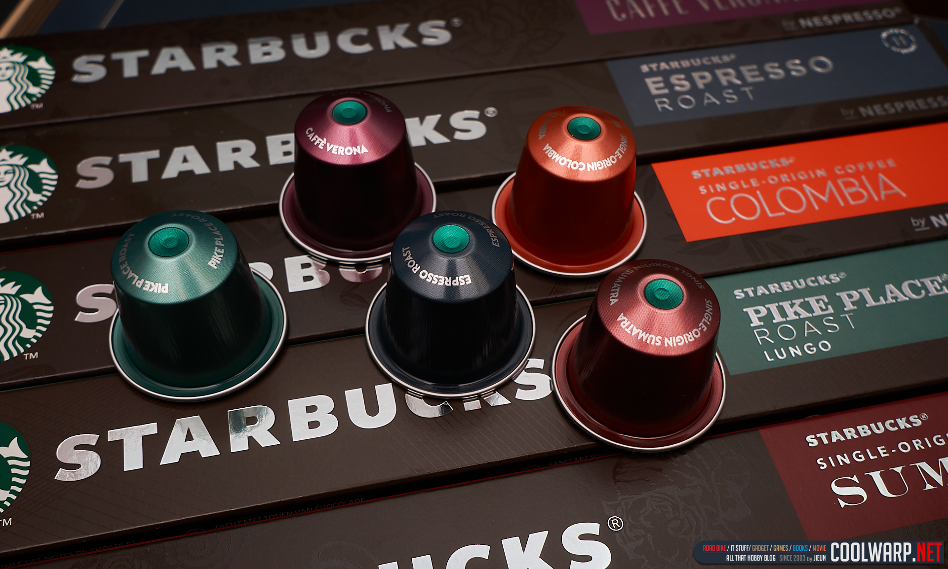 호환 캡슐이 다양하게 포진해 있는 네스프레소 오리지널 시리즈인만큼 스타벅스 제품도 꽤 유명한데 그중에서 5가지를 선별해봤다. 미디엄 로스팅된 파이크 플레이스, 콜롬비아, 스타벅스의 기본이라 할 수 있는 다크 로스팅된 에스프레소 로스트, 까페 베로나, 수마트라의 총 5종이다.