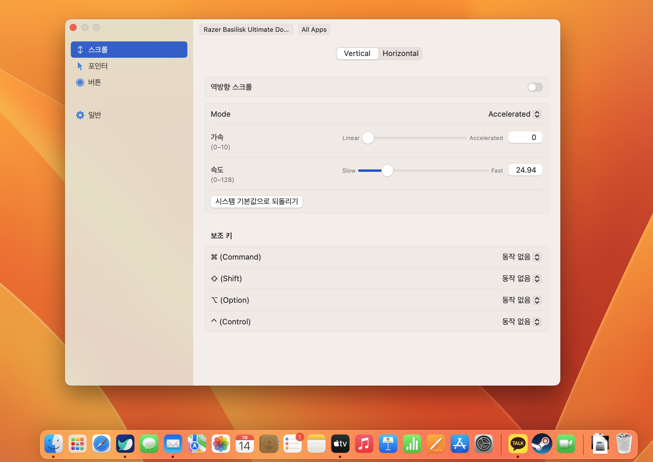 맥미니를 구매하고 키보드와 마우스는 KVM을 이용해서 기존 윈도 데스크탑과 공유를 하는데, 둘 다 하필 애플에서 앱을 지원하지 않는 Razer 제품들이다. 정확하게는 Huntsman V2 TKL을 키보드로, Basilisk Ultimate를 마우스로 사용 중인데 세팅을 할 수 없어도 기능 자체는 알아서 잘 작동하기에 그냥저냥 사용했지만 하루 이틀 사용하면서 마우스 움직임에 큰 위화감을 느꼈다.