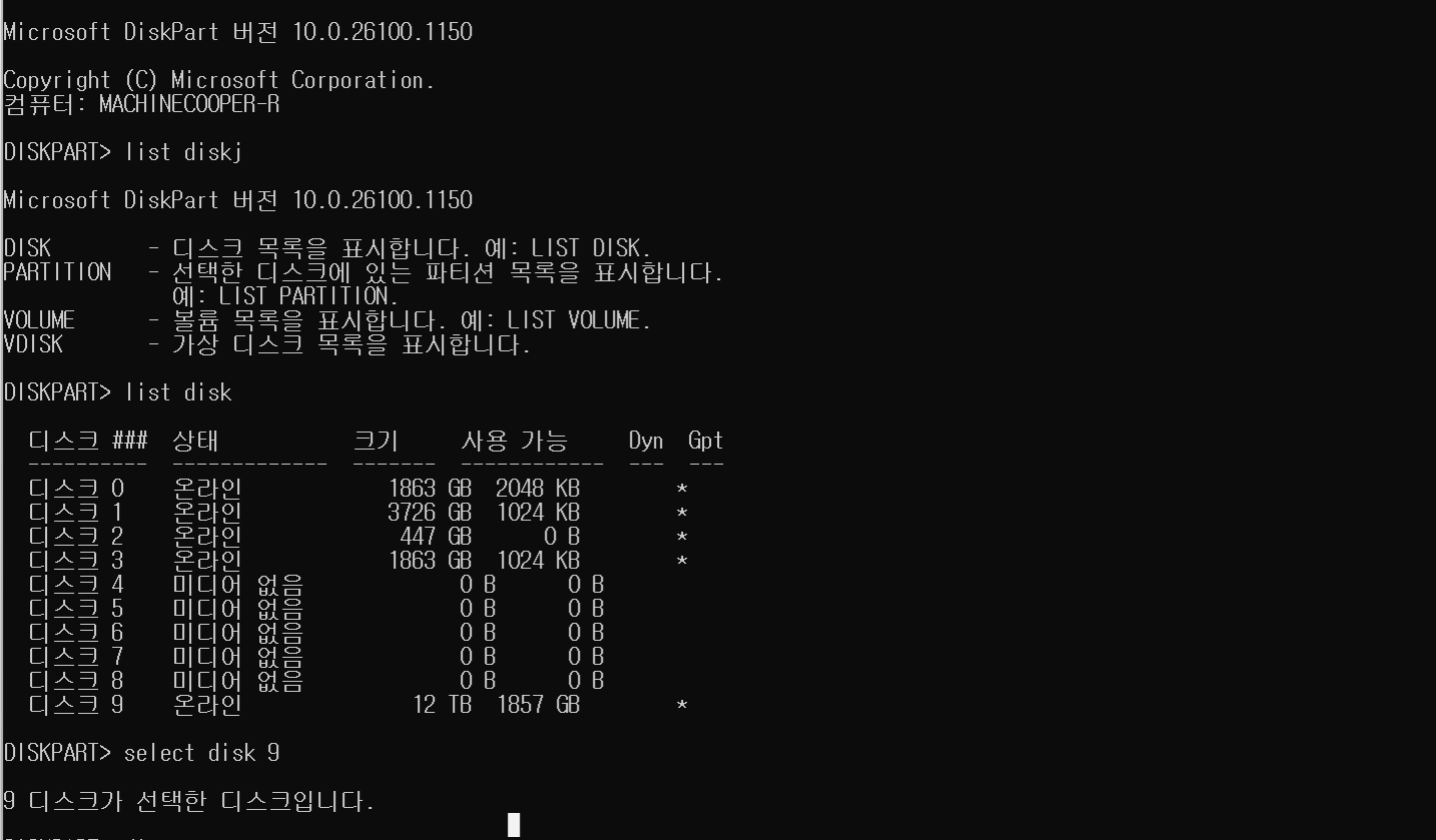 diskpart> select disk 9(해당 디스크 번호 입력)